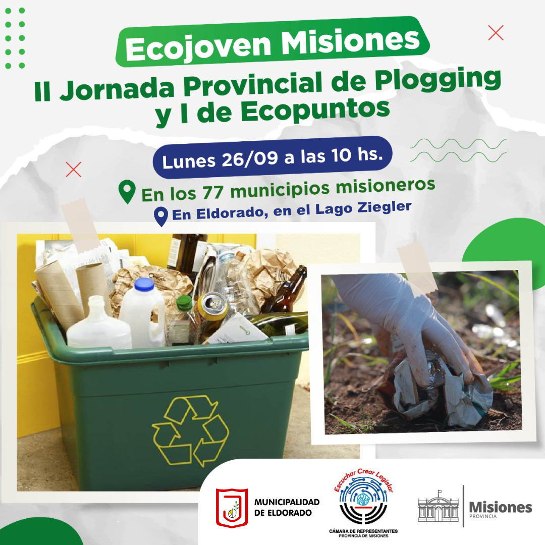 El lunes 26 de septiembre a las 10 horas en el Lago Ziegler se llevará a cabo la 2ª Jornada Provincial de Plogging y 1ª Jornada de Ecopuntos en la ciudad de Eldorado.