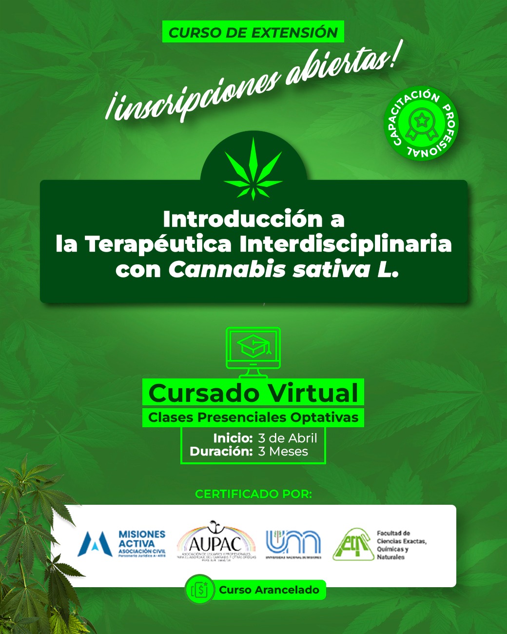 El Curso de Extensión Introducción a la terapéutica interdisciplinaria con Cannabis sativa L. fue diseñado para profesionales del equipo de salud y otras personas interesadas en la temática.
