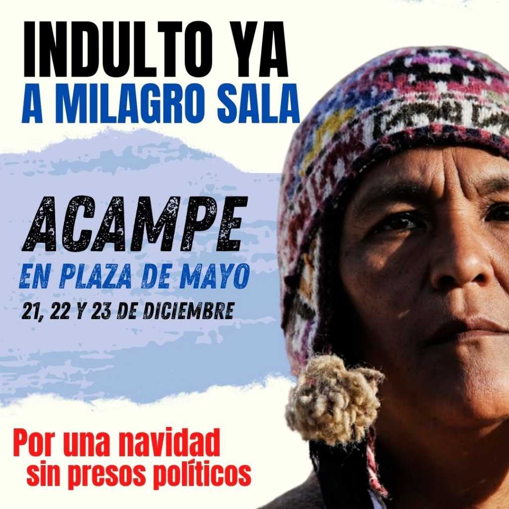 A las 16 horas concentramos en Avda. de Mayo y 9 de Julio y marchamos hacia la Plaza de Mayo donde acamparemos el 21, el 22 y el 23 de Diciembre, reclamando el INDULTO YA a nuestra compañera MILAGRO SALA, presa política de las pretensiones de Gerardo Morales, por haberse agotado las vías institucionales tras la vergonzosa ratificación de su condena por la Corte Suprema de las Injusticias.