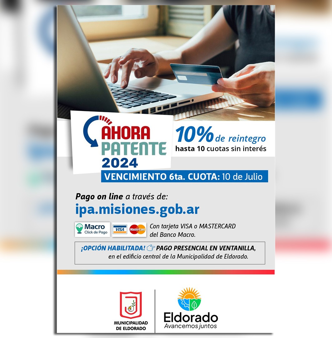 La Dirección de Rentas Generales de la Municipalidad de Eldorado informa que el día miércoles, 10 de julio, vence la 6ta y última cuota del IPA (Impuesto Provincial del Automotor).