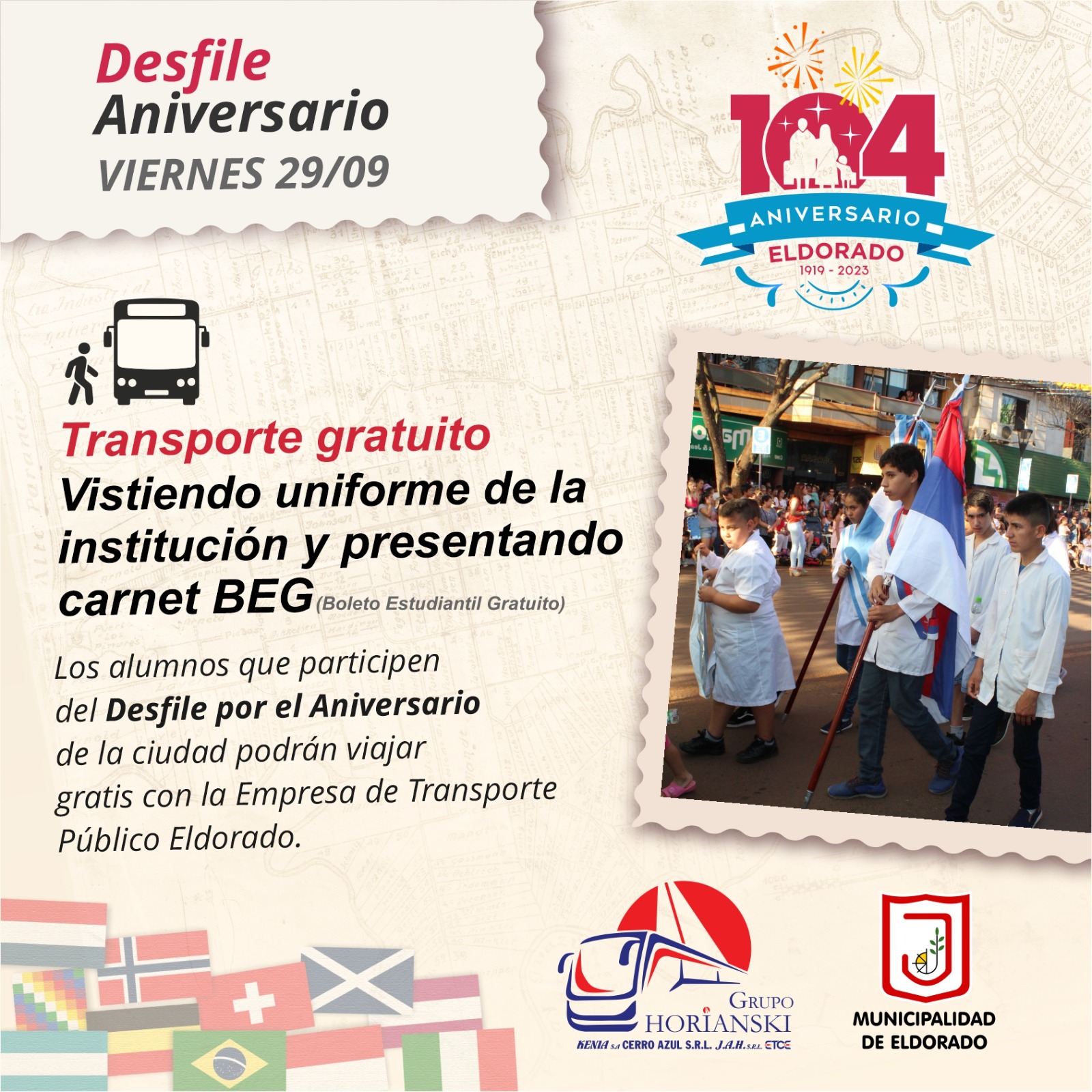 La Municipalidad de Eldorado y el Grupo Horianski informan que los alumnos que participen del Desfile por el 104º Aniversario de la ciudad, este viernes 29 de septiembre, podrán viajar gratis con la Empresa de Transporte Colectivo Eldorado. Los estudiantes podrán acceder al servicio vistiendo uniforme de la institución y presentando carnet BEG (Boleto Estudiantil Gratuito)