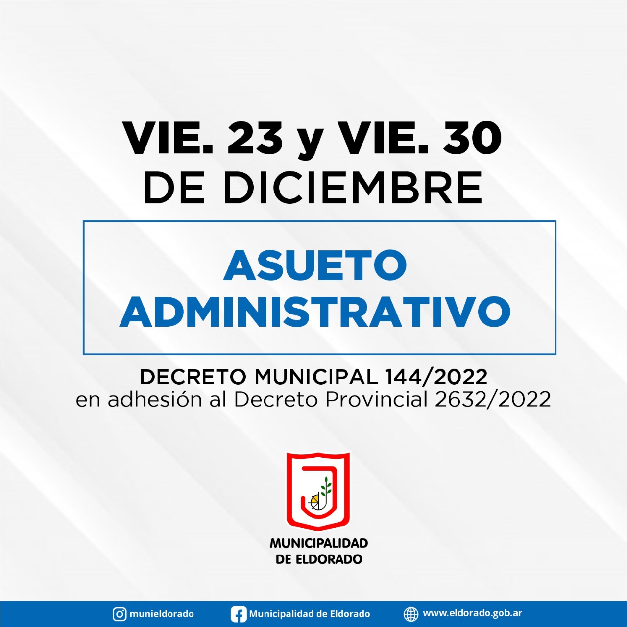 Desde la Municipalidad de Eldorado se informa que, a través del Decreto Municipal N° 144/2022, se adhiere al Decreto Provincial N° 2632/2022 que declara Asueto Administrativo los días 23 y 30 de diciembre de 2022 para la administración pública.