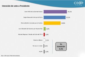 En ella se destaca la paridad entre Javier Milei y Sergio Massa, con 2 puntos de diferencia a favor del economista libertario, mientras que Patricia Bullrich no puede retener los votos de Rodríguez Larreta y queda a distancia de los 2 primeros, confirmándose estos números el ballotage serio entre Milei y Massa.