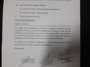 Si bien no es novedad que los dirigentes de la Cooperativa de Electricidad de Eldorado desbarrancaron su camino prestacional y enlodaron la herencia dejada por los pioneros que la crearon en 1951, parecieran en la actualidad empeñarse en trasgredir todo límite moral y estatutario. El último y vergonzante episodio se dió a partir de un memorándum institucional dirigido a TODO EL PERSONAL -con las firmas del Gerente General, el Gerente de Recursos Humanos y la Asesora Legal, a través del cual se los «invitaba a una reunión informativa» que se realizó finalmente el pasado martes a las 20:30 horas en el Salón de los Delegados.