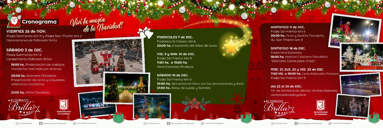 Con el gran desfile de carrozas, la feria navideña, el encendido del árbol de luces del kilómetro 6, y las decoraciones en la Plaza Sarmiento, en la Plaza San Martín y en la Plazoleta del Colono, Eldorado volverá a vivir una navidad y un año nuevo lleno de luces, música, color y mucha alegría.