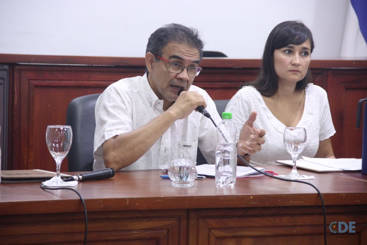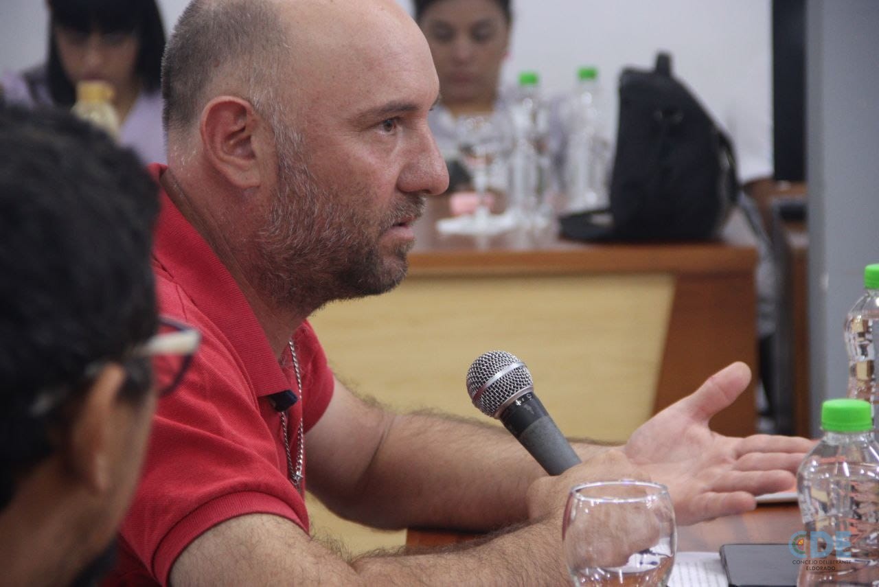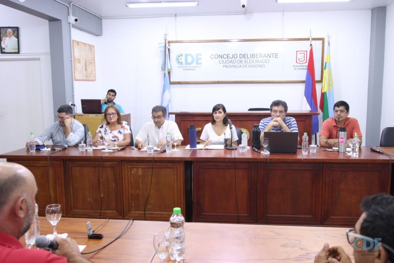En el Concejo Deliberante de Eldorado se llevó a cabo una reunión con la presencia de los concejales Augusto Daniel González, Águeda Saenger, Sebastián Tiozzo, Bernardino Bobadilla, y la presidenta del Concejo Deliberante, Lorena Cardozo; acompañados por el asesor jurídico, German Chemes.