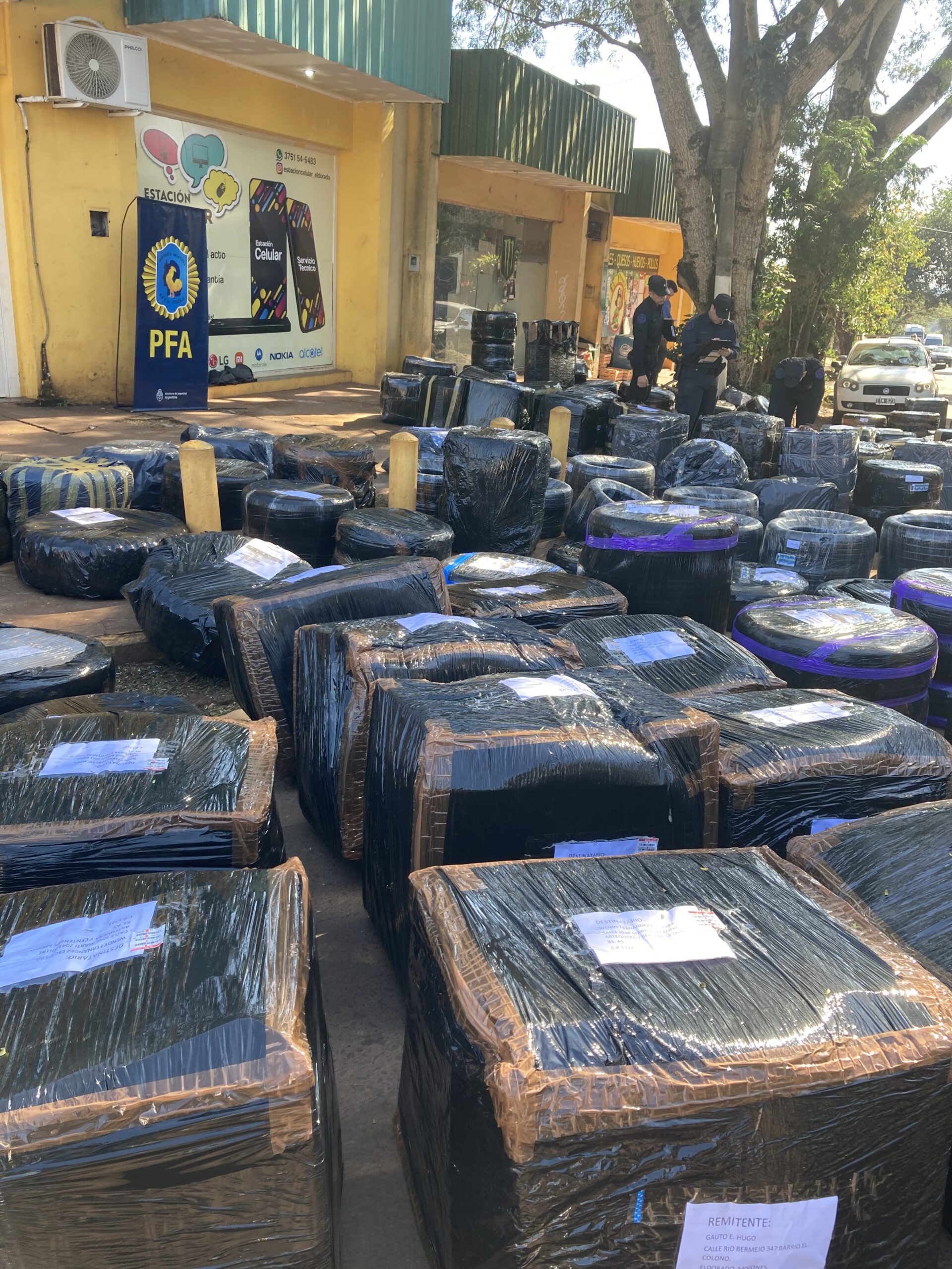 En el lugar, los miembros de la fuerza federal incautaron 127 paquetes que contienen neumáticos, cuya pretensión era la de ser enviados a distintos puntos del país. A pesar del hermetismo oficial, trascendió que tras tareas de inteligencia, los policías desbarataron una red delictiva que opera en la región, cuyo modus operandi es -luego de ingresar al país los neumáticos sin el correspondiente aval aduanero, enviarlos a través del sistema de encomiendas del Correo Argentino dentro de cajones de madera -los de mayor rodado para camionetas y camiones; o bien los de menor diámetro, envueltos en cinta de embalar y luego recubiertos con envoltorios de plástico. De acuerdo a la información obtenida, en el procedimiento de envío participaron muchas personas con domicilio local, y los destinatarios también son diversos; especialmente domiciliados en las provincias de Buenos Aires y Santa Fe. Por la magnitud de la maniobra, se descarta la infracción al Código Aduanero y se tramita una causa por el delito de contrabando en el Juzgado Federal de Eldorado. El aforo total del allanamiento realizado esta mañana podría superar los 50 millones de pesos, según estimaciones extraoficiales.