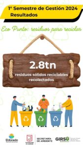 Durante el primer semestre del año 2024, y con la puesta en funcionamiento del EcoPunto Eldorado, se recolectaron 2.8 toneladas de residuos sólidos reciclables, y se recibieron 124 frascos para reutilizarlos, como parte de la iniciativa Dulce Eco Canje.