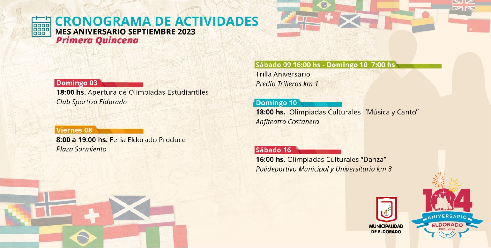 La ciudad de Eldorado comienza a transitar el mes aniversario y desde la Municipalidad se trabaja para desarrollar distintas actividades en este marco. Ferias, encuentros sociales, deportivos y las distintos eventos por el mes de los estudiantes se llevarán adelante en el marco del 104° Aniversario de la Capital del Trabajo.