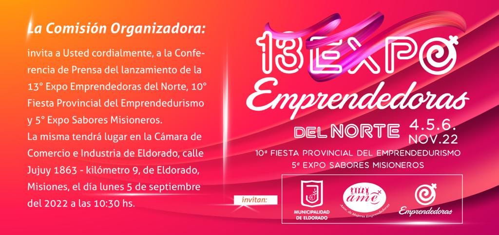 Este lunes 5 de septiembre se realizará la Conferencia de Prensa del Lanzamiento de la 13° Expo Emprendedoras del Norte, 10° Fiesta Provincial del Emprendedurismo y 5° Expo Sabores Misioneros. La presentación será en la Cámara de Comercio e Industria de Eldorado, a las 10:30 hs.