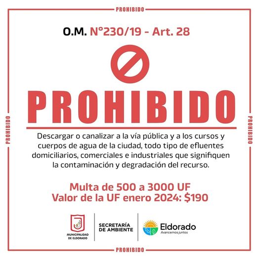 La Secretaría de Ambiente de la Municipalidad de Eldorado recuerda que por la Ordenanza Municipal N°230/19 queda «Prohibido canalizar o descargar a la vía pública y a los cursos y cuerpos de agua de la ciudad, todo tipo de efluentes domiciliarios, comerciales e industriales que signifiquen la contaminación y degradación del recurso».