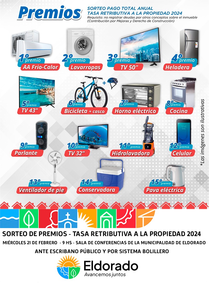 La Secretaría de Hacienda de la Municipalidad de Eldorado informa que el miércoles 21 de febrero se llevará a cabo el sorteo de los premios por pago total de la Tasa Retributiva a la Propiedad 2024, ante Escribano Público y por sistema bolillero.