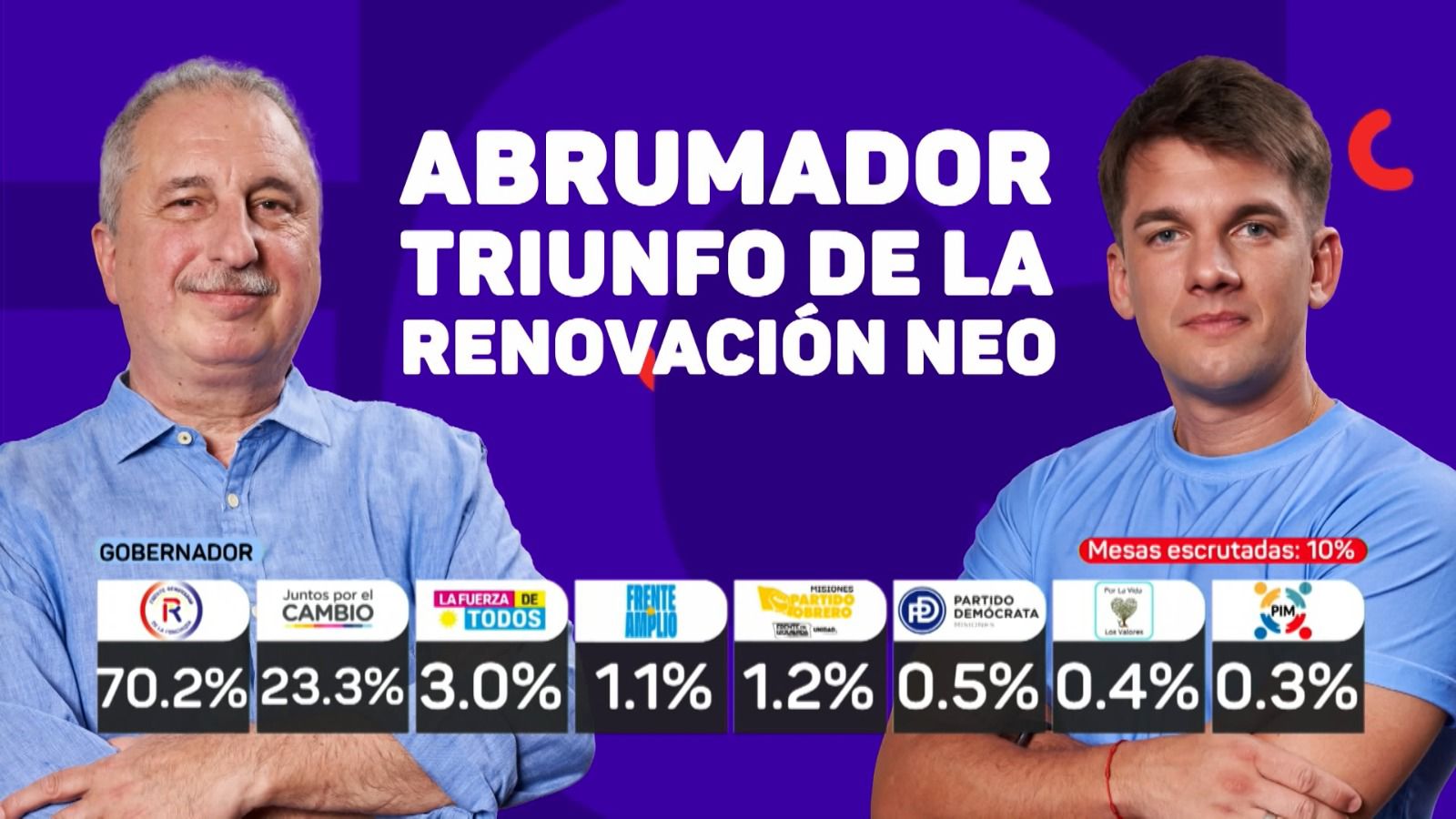 Al cierre de los comicios y con un 70,2% de los votos, el Frente Renovador le saca una diferencia infranqueable de puntos a Juntos por el Cambio Misiones que suma 23,3% del total. Una diferencia irreconciliable para el escrutinio definitivo que se realizará a partir de mañana. Por su parte el Frente de Todos suma un 3,0% solamente.
