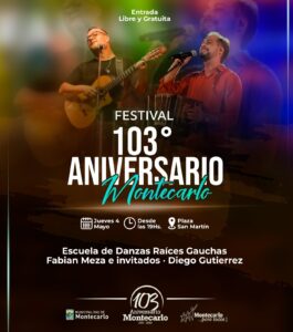 Por la tarde, a partir de las 19.00 hs, la Plazoleta La Paloma será el escenario del “Festival 103° Aniversario de Montecarlo”. Este evento contará con la presentación de varios e importantes números artísticos, que deleitarán al público asistente con su música y sus bailes tradicionales.