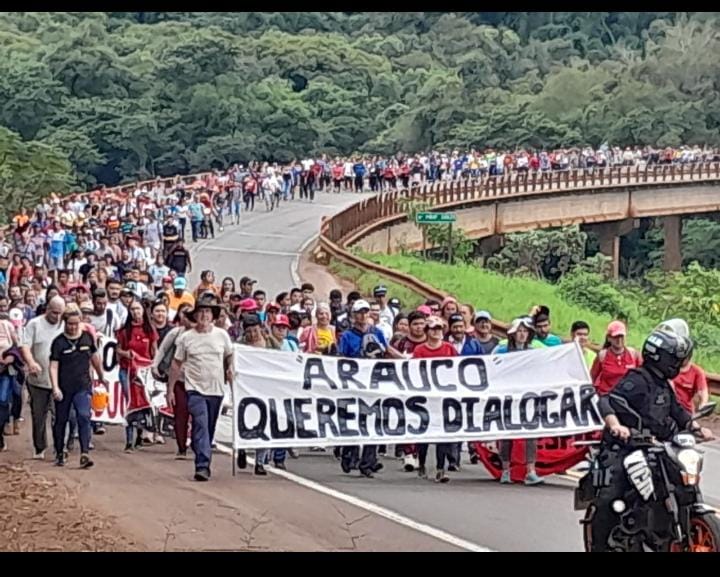 Masiva movilización y reclamo de movimientos sociales se realizó este pasado martes hacia la planta industrial de la multinacional Arauco en Puerto Piray. Demandan mayores puestos de trabajo y libertad sindical, la acusan de posición dominante dentro del sector, exigen frenar la contaminación ambiental y una tributación impositiva sin exenciones al estado provincial. Desde Eldorado y Montecarlo los manifestantes caminaron por la ruta nacional 12 hasta confluir en el acceso a Piray. En la foto, al momento de trasponer el puente sobre el arroyo Piray Guazú.