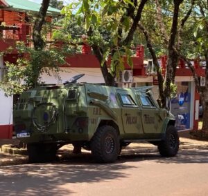 Al mediodía del sábado el sol laceraba impiadoso. Después de visitar la Fiesta Nacional del Emprendedurismo, avancé por calle Malvinas hasta que en la intersección con Claudio Rodrigo dos uniformados -portando armamento de gran calibre- velaban tras un endeble encintado de no avanzar. A 50 metros de allí, se veía el agitado movimiento de efectivos envueltos en chalecos azules desde donde resplandecía la sigla PFA y los distintivos de la fuerza federal. Varios vehículos oficiales y otros -al parecer utilizados para “actividades de inteligencia”- ocupaban el frente de la delegación local policial. Aunque lo más llamativo era una unidad acorazada, la que estaba apostada “cumpliendo la integralidad logística, más información no estoy autorizado a darle”, expuso el celoso custodio.