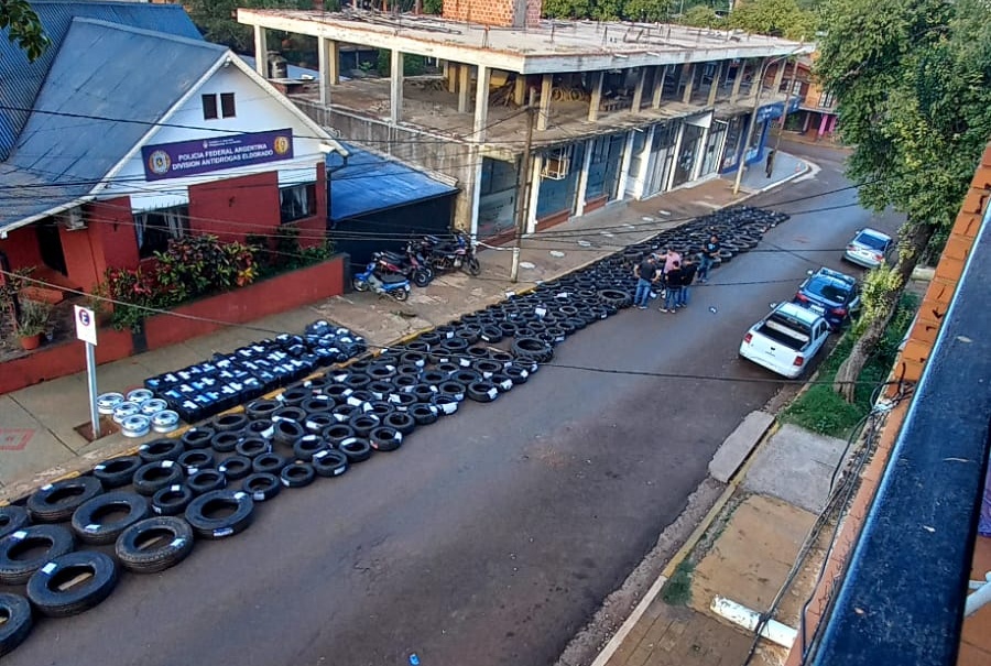 Al menos una veintena de policías preparaban el escenario para exhibir el fruto de sus pesquisas: una gran cantidad de neumáticos y llantas decomisadas -presumiblemente sin aval aduanero, así como más de diez personas detenidas en allanamientos realizados en diferentes puntos de la ciudad -en particular la zona oeste- y en otras localidades del norte de Misiones.