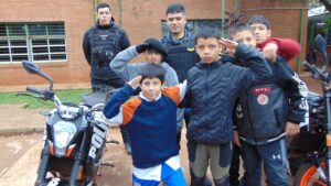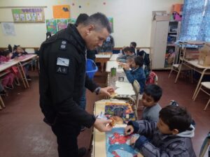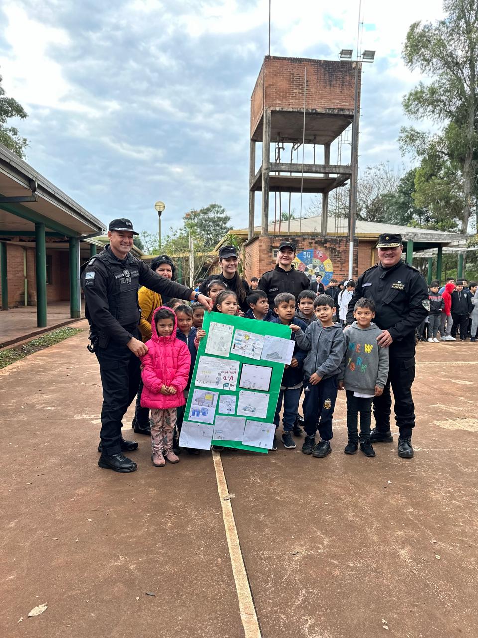 Agasajando en el lugar a los más de 150 alumnos de diferentes grados, con una chocolatada y facturas, además se brindó una breve reseña de la Institución y se exhibió los patrulleros, motocicletas y los uniformes que utilizan las Divisiones especiales.