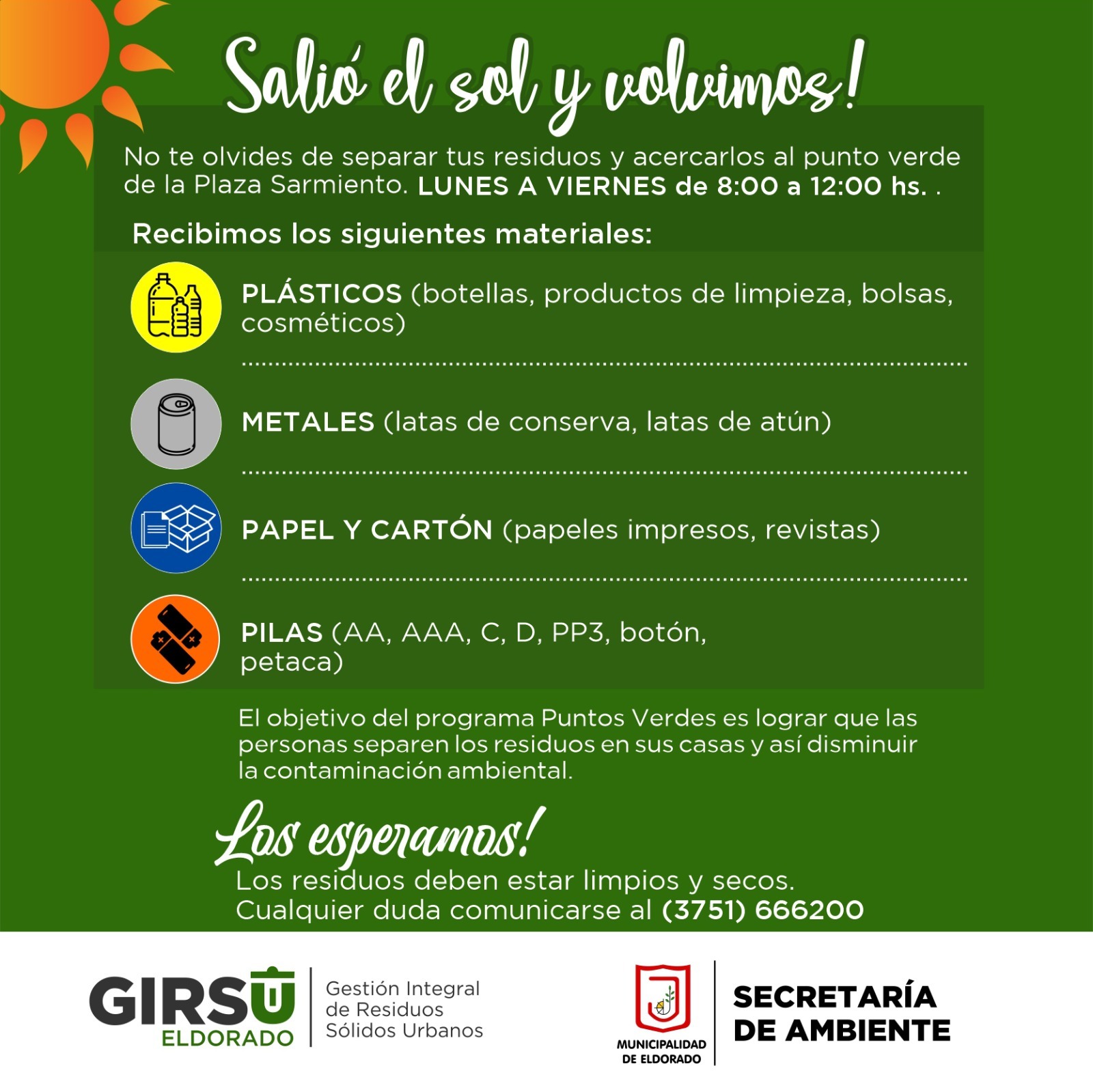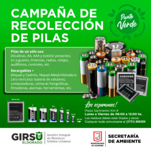 Desde la Secretaría de Ambiente de la Municipalidad de Eldorado se continúa trabajando con los “Puntos Verdes” en la Plaza Sarmiento, con los contenedores donde se pueden depositar cartón, papel, plásticos y metales y pilas.