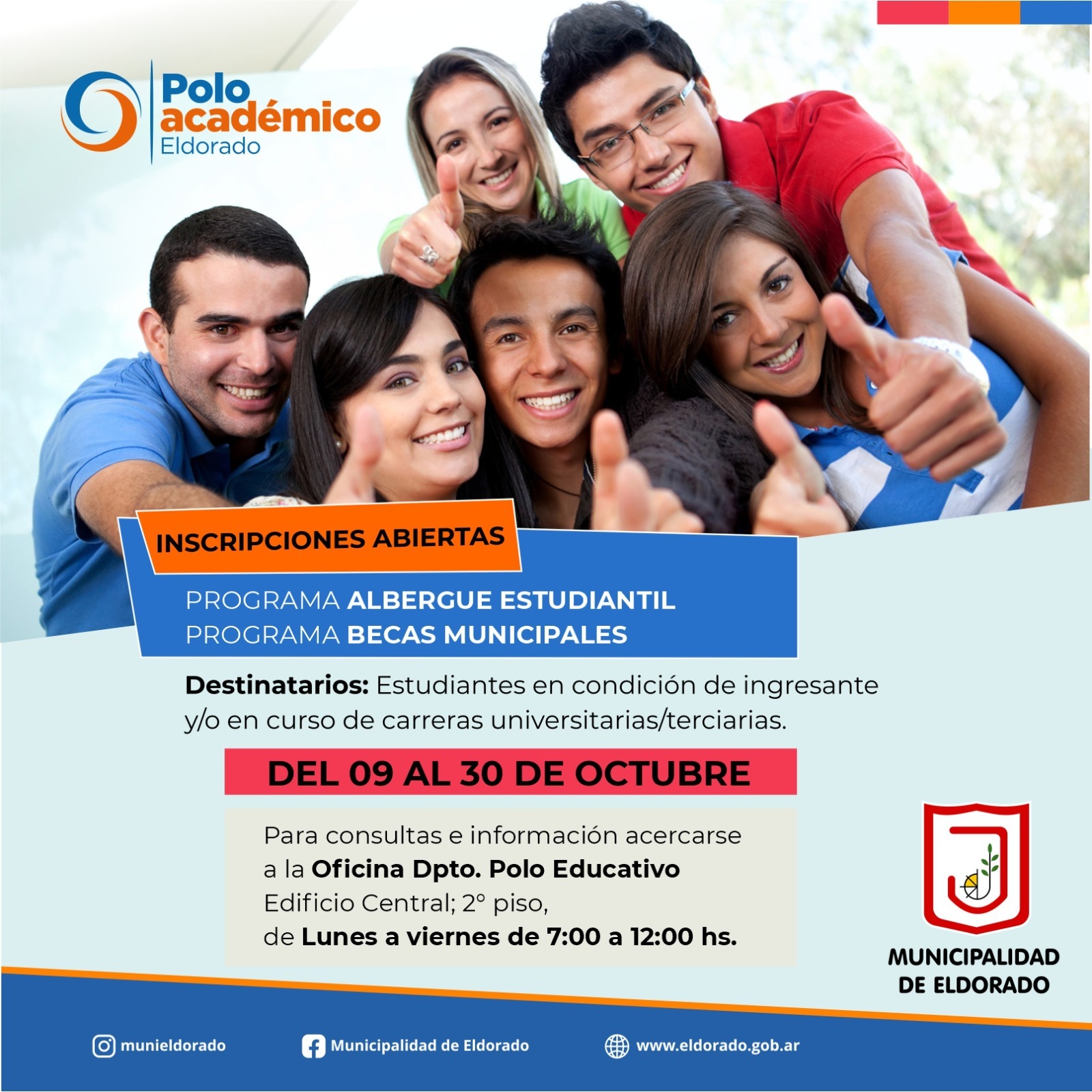 Desde el Polo Académico de la Municipalidad de Eldorado se informa a los estudiantes de la ciudad que se encuentran abiertas las inscripciones para acceder a los beneficios de los programas “Albegue Estudiantil» y «Becas Municipales».