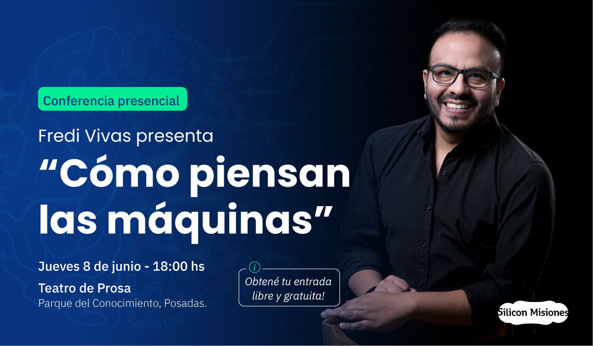 Fredi Vivas se presentará el 8 de junio de 2023 a las 18:00 en el Teatro de Prosa del Parque del Conocimiento de Posadas. La charla “Cómo piensan las máquinas” es de acceso libre y gratuito, y tiene un cupo presencial limitado.