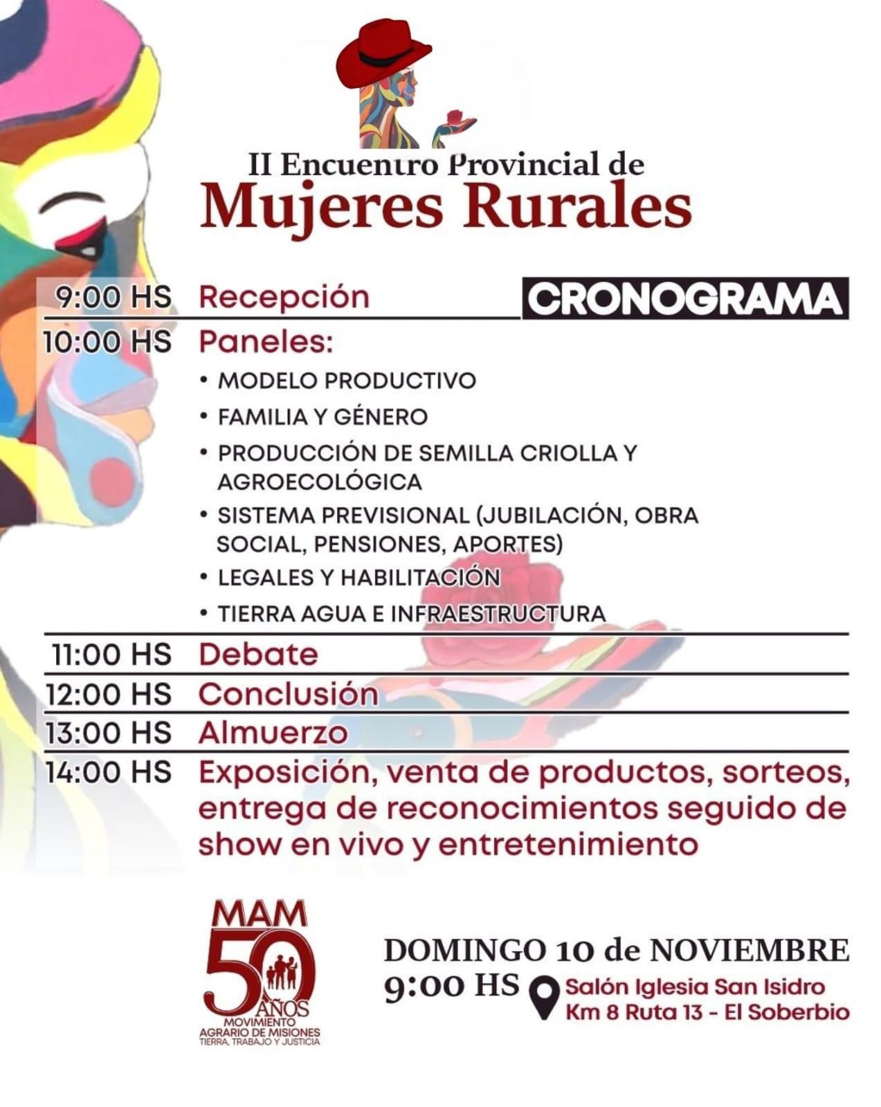 Desde el Movimiento Agrario Misiones (MAM) convocan al ll Encuentro Provincial de MUJERES RURALES de Misiones, que se llevará a cabo el día 10 de noviembre en el salón de la iglesia San Isidro, en la localidad de El Soberbio.