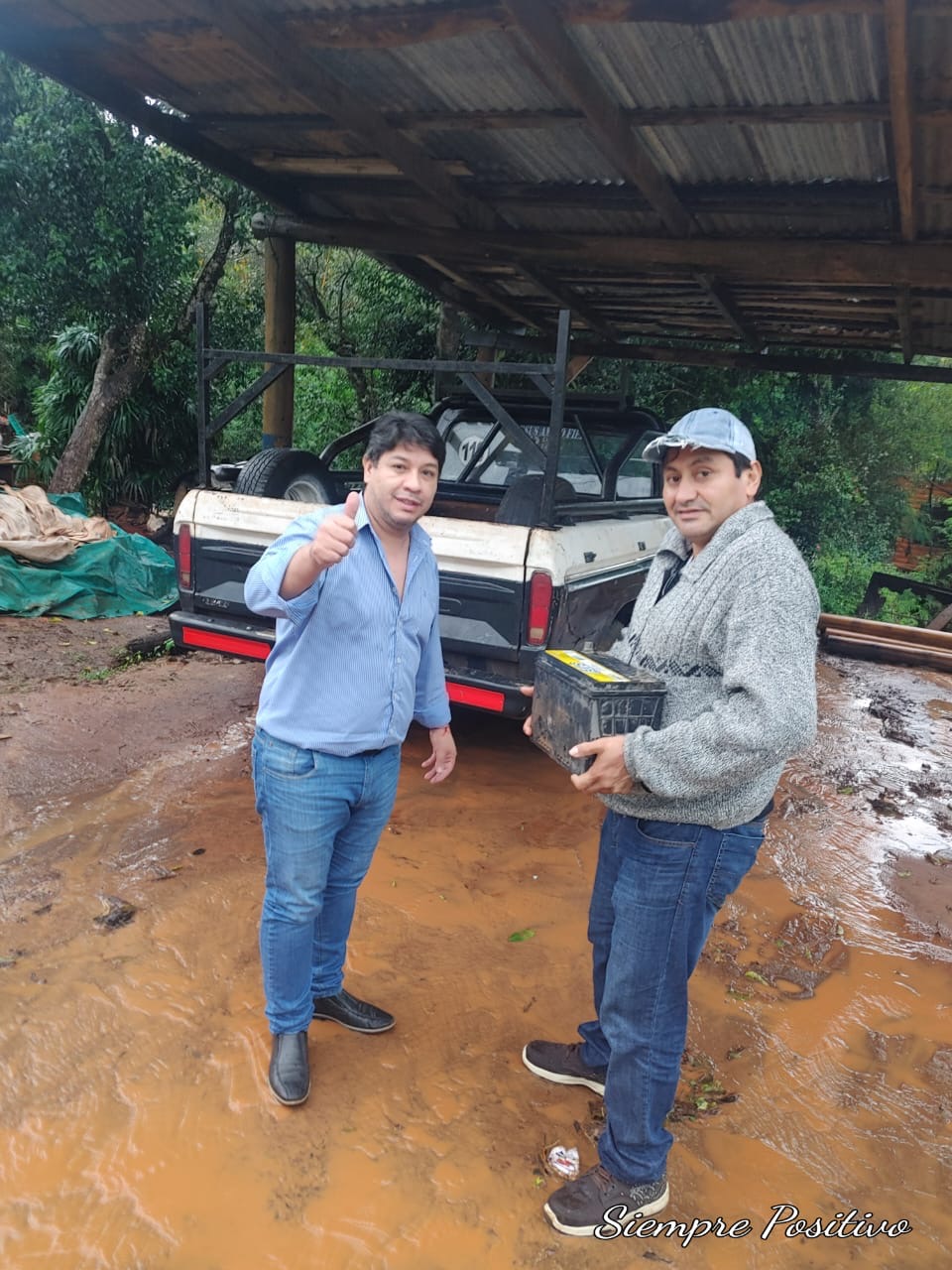 Fabián acudió al programa “Sálvese quien pueda” de @multimediosgenesis para relatar lo sucedido, entremezclando impotencia y resignación. Pocos minutos más tarde, entre los cuantiosos mensajes de aliento y apoyo que enviaban los oyentes, se destacó uno que puso a disposición de Fabián una batería: “mientras tenga mi camioneta en el taller, puedo prestársela”, ofreció Luis Núñez, del barrio San Martín. E instantes después Aldo Caballero se sumó para buscar la batería y trasladarla desde allí hasta la vivienda del damnificado. En menos de una hora de conocerse el caso, la batería de Luis estaba en la camioneta de Fabián, trasladada por Aldo. Bastó un pedido a través de un medio de comunicación radial para que se produjeran acciones solidarias y virtuosas. Podemos coincidir en que no todas las solicitudes tienen inmediatez en la respuesta, o que no fue la solución definitiva; incluso en que los delincuentes vuelvan a intentarlo una vez más. Pero lo cierto es que la empatía entre vecinos eldoradenses demostró que tan sólo un gesto pone a rodar la cadena de favores y a la solidaridad no la para siquiera la torrencial lluvia. Foto 1 – Aldo y Fabián. Foto 2 – Luis #solidaridadyempatía #eldorado, misiones