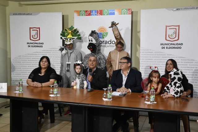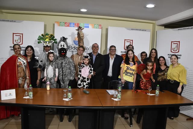 El intendente Rodrigo Durán, junto a los representantes de las comparsas eldoradenses, el Director de Cultura Fausto Rizzani, la Directora de Turismo, Luciana Quiroz y la Directora de Cultura de Puerto Piray, Vilma Román, realizaron el lanzamiento de los Carnavales Regionales 2025.