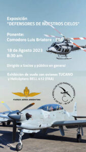 La actividad se llevará a cabo a partir de las 8.30 horas con una exposición que incluirá una charla y una muestra interactiva con imágenes y una exhibición de vuelo con aviones Tucano y Helicóptero BELL 412 (FAA) . Esta jornada está destinada a pilotos, socios, escuelas y público en general con entrada libre y gratuita.