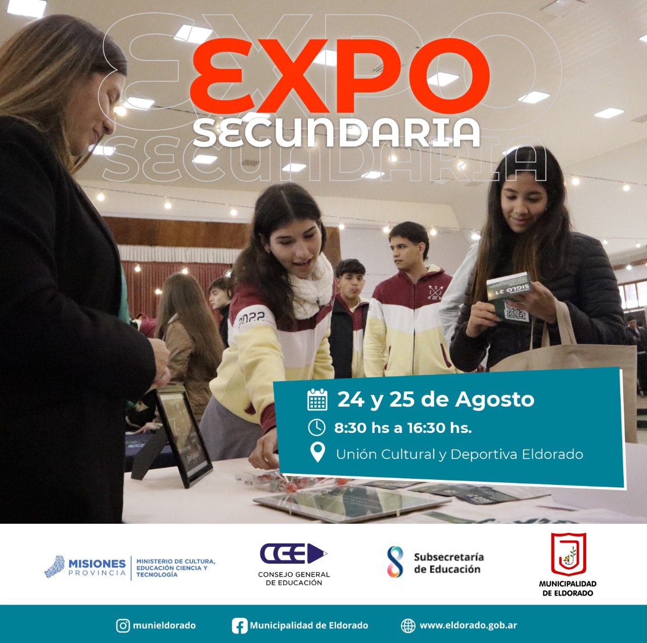 A través del polo Académico de la Municipalidad de Eldorado se realizará la Expo Secundaria en la Unión Cultural y Deportiva los días 24 y 25 de agosto de 8 a 18 horas. Serán 19 instituciones escolares, públicas y privadas, las que expondrán información y la oferta de formación a chicos y chicas que están finalizando sus estudios primarios.