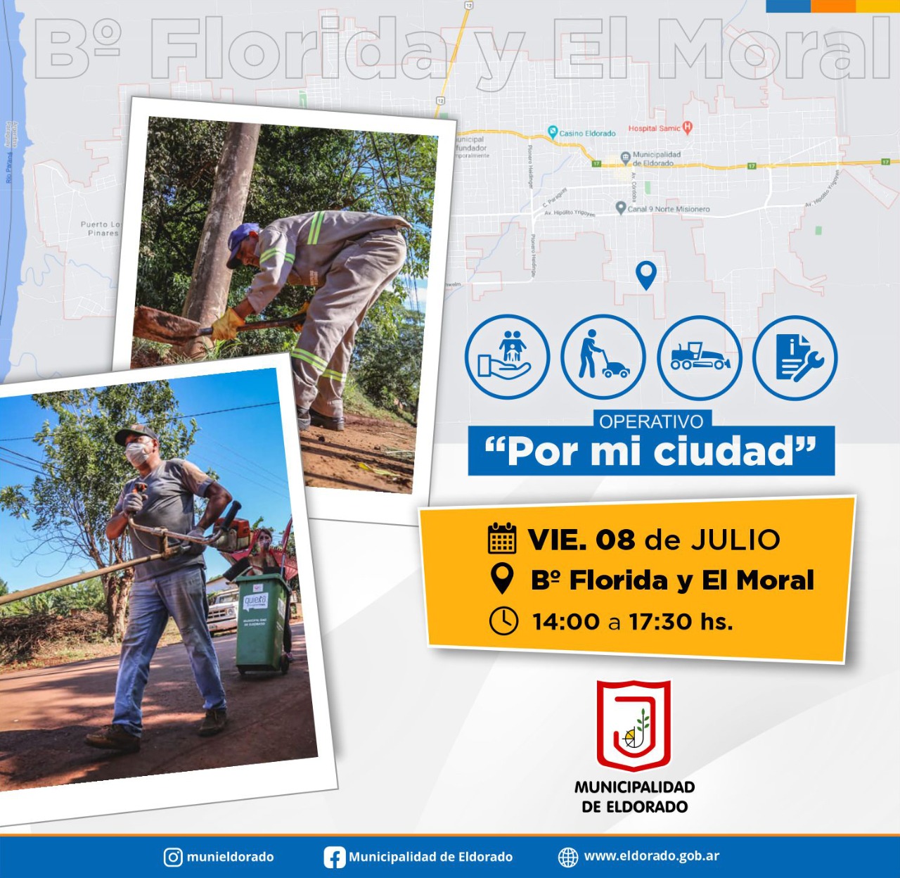 Este viernes, 8 de Julio, con un gran despliegue de los distintos sectores del municipio, se llevará adelante un nuevo operativo integral «Por Mi Ciudad». Será desde las 14 hasta las 17.30 horas, abordándose en la oportunidad las comunidades barriales de Florida y El Moral.
