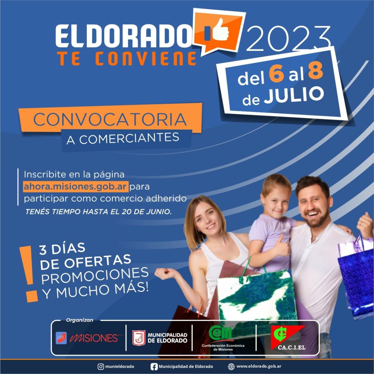 Desde la Municipalidad de Eldorado y el Gobierno de la Provincia de Misiones, junto a la Cámara de Comercio e Industria de Eldorado, se está trabajando para la 3ra Edición de «Eldorado te Conviene». Los días jueves 6, viernes 7 y sábado 8 de julio este programa especial permitirá ofrecer financiación con tarjetas emitidas por Banco Macro en hasta 6 o 12 cuotas sin interés de acuerdo a su actividad. El Gobierno provincial acompaña estas iniciativas comerciales a través del programa “Ahora Misiones”. Los comercios que ya estén adheridos a los programas “Ahora Misiones”, “Ahora Bienes Durables” y “Ahora Misiones + 21 %” participarán automáticamente, mientras que aquellos que deseen unirse tendrán tiempo hasta el 20 de junio, ingresando a: https://ahora.misiones.gob.ar/#/home.