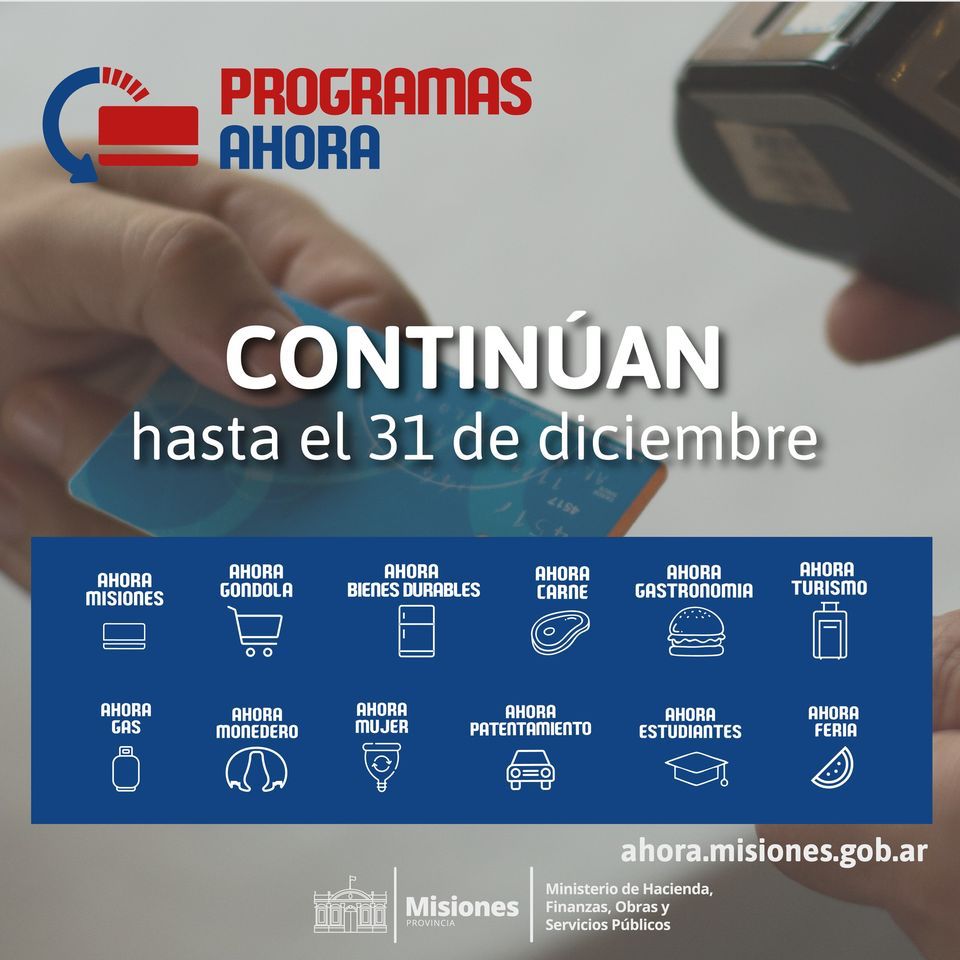 El Gobernador Oscar Herrera Ahuad anunció que hasta el 31 de diciembre de este año seguirán vigentes los programas Ahora Misiones, Ahora Bienes Durables, Ahora Mujer, Ahora Estudiantes, Ahora Góndola, Ahora Carne, Ahora Gastronomía, Ahora Feria, Ahora Turismo, Ahora Patentamiento y Ahora Monedero.