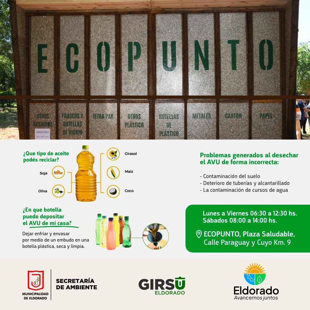 La Secretaría de Ambiente de la Municipalidad de Eldorado informa que, en el marco del Plan Local de Gestión de Residuos, está vigente la recepción de Aceite Vegetal Usado – AVU en el Ecopunto de nuestra ciudad.