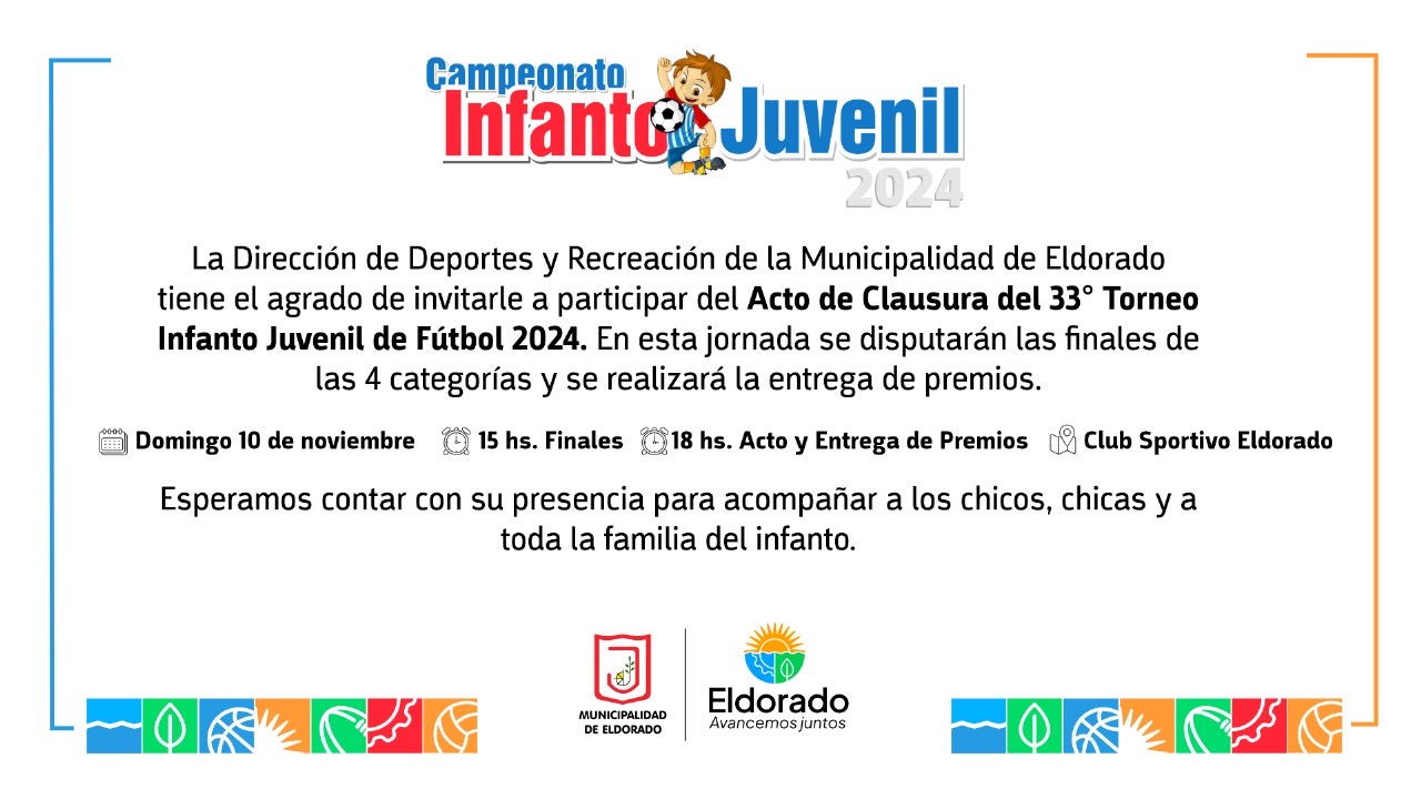 Recordamos la definición de la 33° Edición del Campeonato Infanto Juvenil de Fútbol 2024, que se llevará a cabo el día Domingo 10 de noviembre en el Club Sportivo Eldorado.