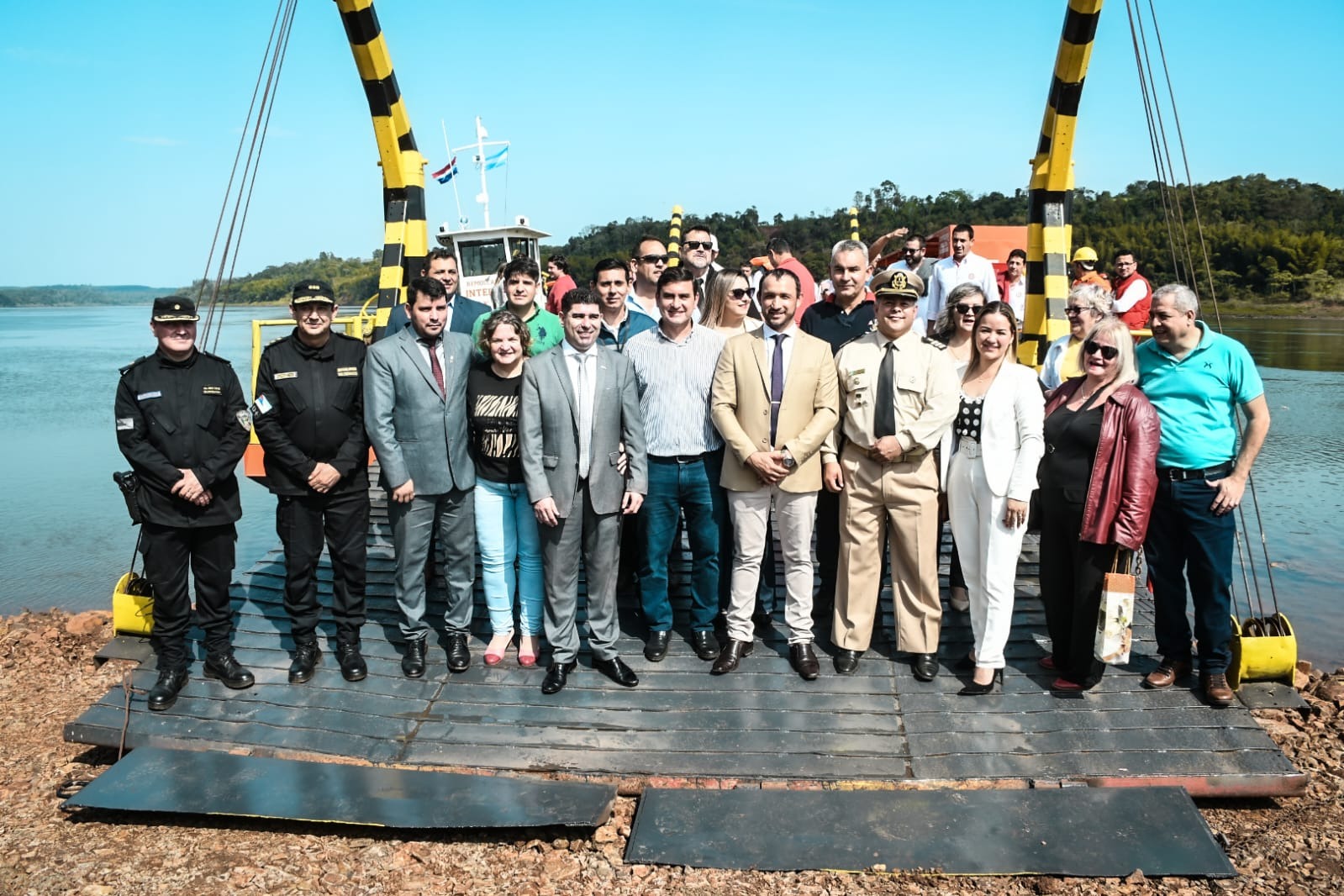Este viernes el Intendente de la ciudad de Eldorado, Dr. Fabio Martínez, recibió al jefe de Misión en el Consulado Paraguayo en Misiones, Dr. Magno Álvarez, al Intendente Municipal de Mayor Otaño, Leonardo Morínigo, quienes llegaron al puerto de nuestra ciudad en el primer viaje de esta balsa cruzando el Río Paraná.