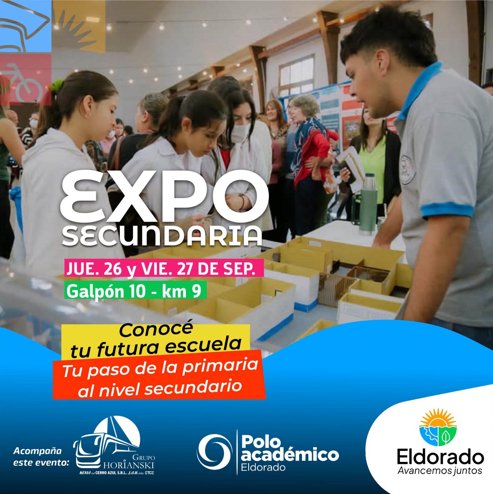 La Municipalidad de Eldorado, a través de Polo Académico, realizará la segunda edición de la Expo Secundaria; la misma tendrá lugar en el Centro Cultural Cooperativo (Ex Galpón 10) los días 26 y 27 de septiembre. En este espacio las instituciones escolares, públicas y privadas, expondrán información sobre su oferta académica a chicos y chicas que están finalizando sus estudios primarios.