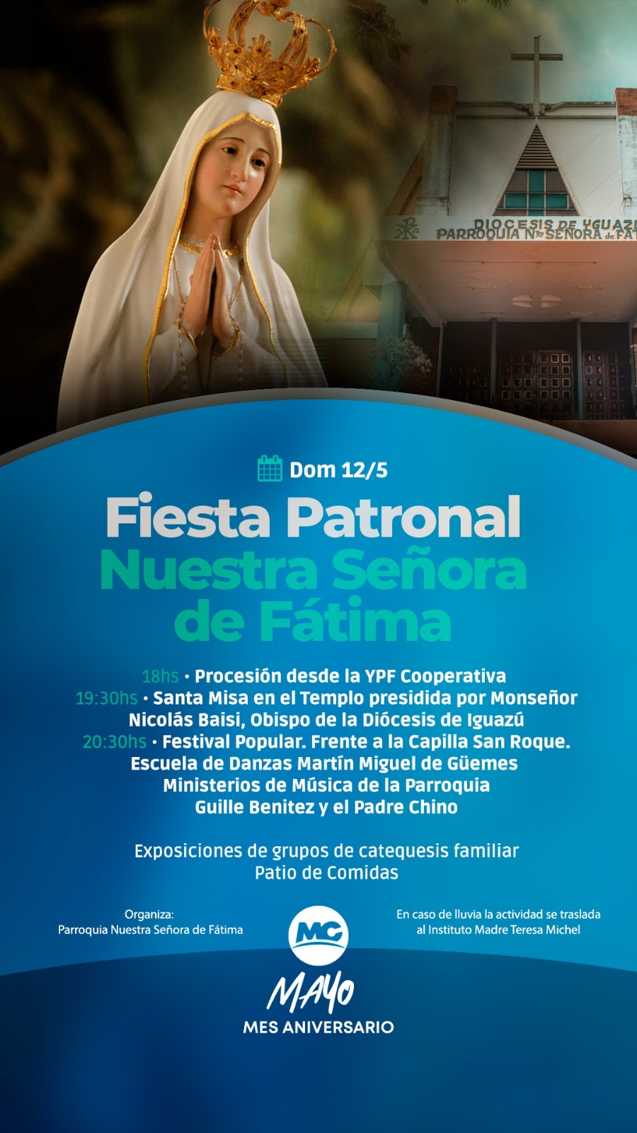 Este lunes 13 de mayo, la ciudad de Montecarlo conmemora a la Virgen de Fátima, su santa patrona. La Municipalidad, en cumplimiento del decreto provincial 316/94, ha decretado asueto administrativo y escolar en todo el ejido municipal.